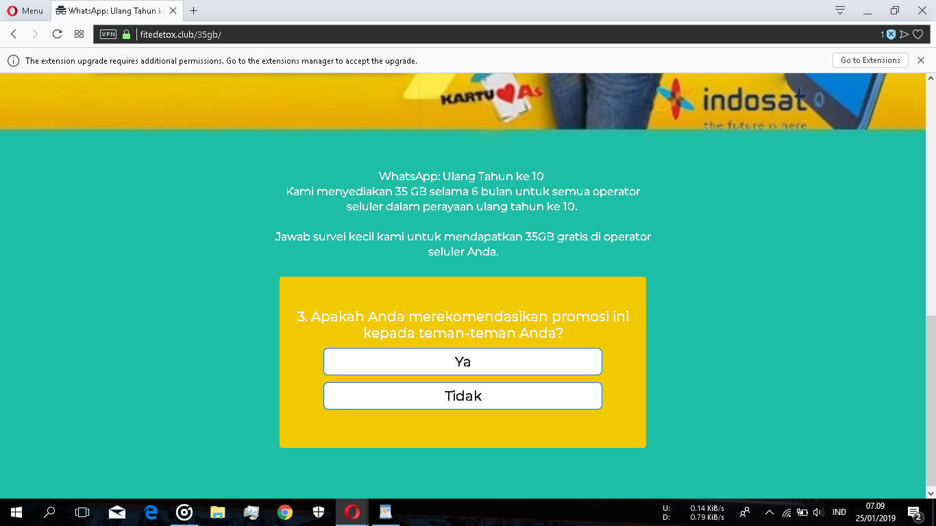 Saat di halaman muka website tersebut kita diwajibkan untuk menjawab surveri kecil-kecilan untuk dapat menerima kuota sebesar 35GB dari Ulang Tahun WhatsApp yang ke 10.