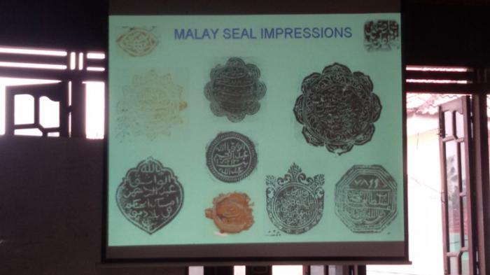 Ia memperlihatkan foto-foto cap asal Jambi. Salah satunya adalah cap pada era Sutan Thaha Syaifudin yang berupa kaligrafi berbentuk angsa.