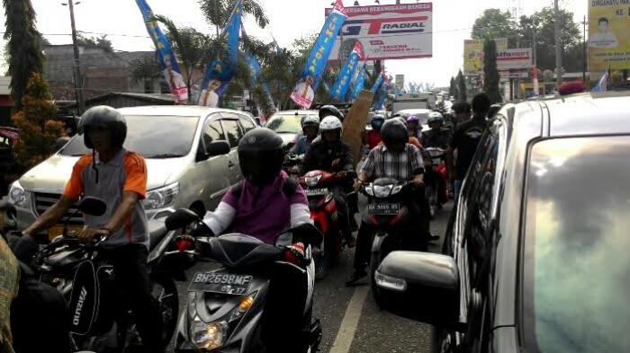 "Pinggiri dulu motornyo, dak biso lewat," ungkap satu diantara pengendara yang tak sabar menunggu kemacetan yang cukup lama.