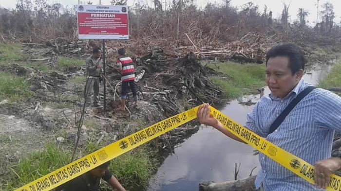 Penyidik Kementerian Lingkungan Hidup dan Kehutanan (LHK), Selasa (10/8) siang menyegel lokasi kebakaran