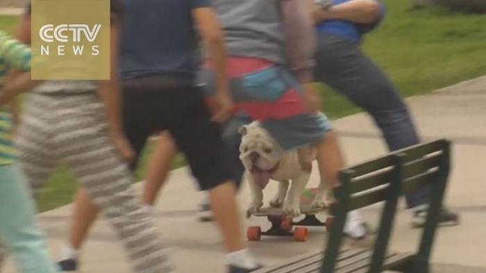 Aksi anjing itu ialah bermain skateboard dengan harus melewati kolongan dari kaki 30 orang yang berjejer.