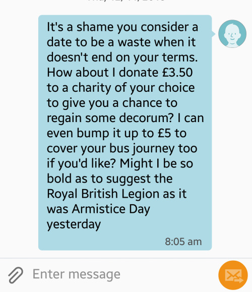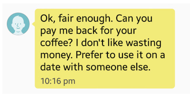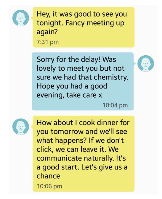 Singkat cerita, setelah mereka kembali ke rumah masing-masing, pria ini mengirimkan pesan pada Lauren yang mengatakan bahwa ia senang dengan perjumpaan tadi, dan mengajak Lauren untuk bertemu lagi. Entah disengaja atau tidak, Lauren baru membalas 2,5 jam kemudian dan menjelaskan bahwa ia tidak tertarik untuk bertemu lagi.