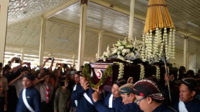 Jenazah kemudian dibawa ke mobil pengantar sekitar pukul 12.10 WIB dengan iring-iringan para kerabat dan abdi dalem serta diiringi salam hormat dari puluhan anggota pramuka saka bhayangkara yang membangun pagar hidup dan membuka jalan bagi peti jenazah.