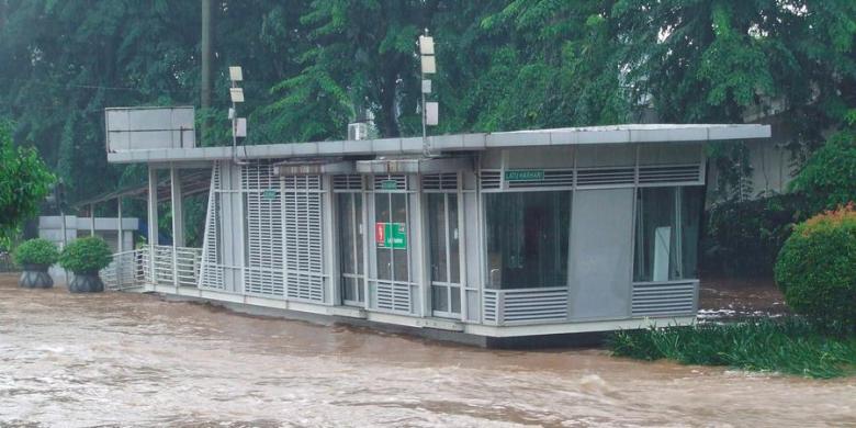 Halte bus transjakarta Latuharhari, Jakarta Pusat yang terendam banjir, Kamis (17/1/2013). Air membanjiri kawasan ini setelah tanggul Kanal Banjir Barat jebol. Paling tidak dari tanggul itu lebih dari dua juta meter kubik air menggenangi pusat Kota Jakarta.
