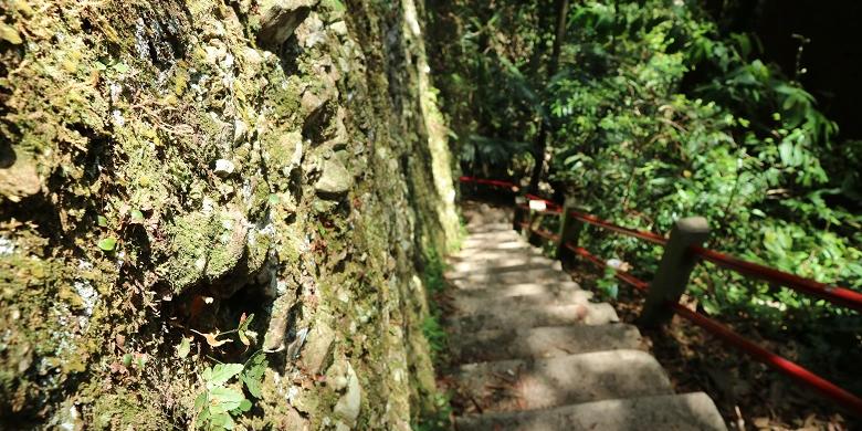 Begitu mulai melangkahkan kaki, tangga-tangga nan terjal menyambut. Rasa pengap sedikit menyulitkan untuk bernapas. Maklum, tangga yang dilewati diapit oleh batuan tebing.