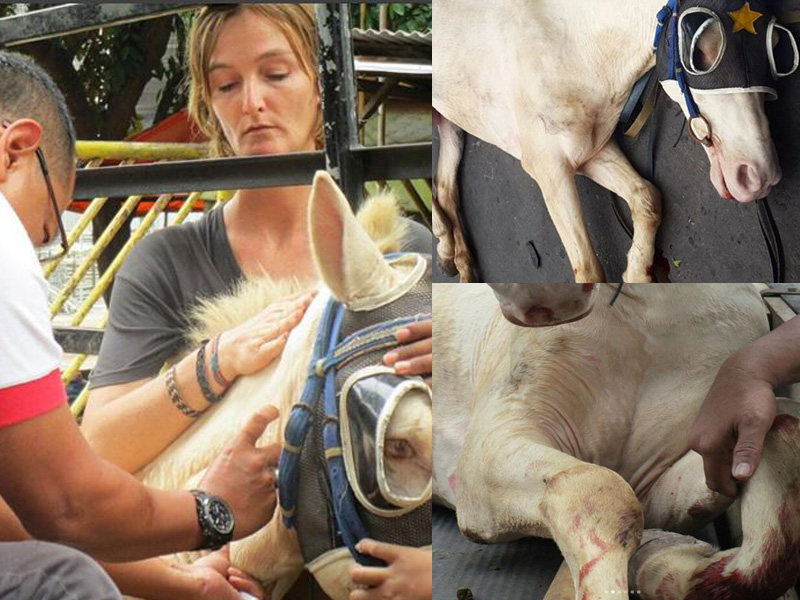 Dari foto yang diunggah di media sosial, terlihat kuda berwarna krem itu sedikit berdarah dalam posisi jatuh telentang di aspal.