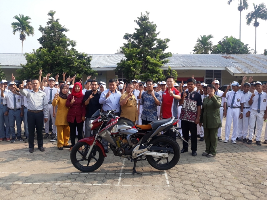 TRIBUNJAMBI.COM, JAMBI - PT Astra Honda Motor (AHM) bersama PT Sinar Sentosa Primatama (Sinsen) sebagai main dealer sepeda motor Honda di Provinsi Jambi, memberikan unit cutting Honda Mega Pro kepada SMK binaan Honda, Senin (12/2). Sekolahan itu SMK Prasasti Karang Berahi (PRASKAB).
