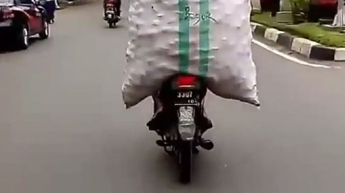 Bikin Melongo! Video Pengendara Motor Bawa Karung Setinggi 'Monas', Kok Enggak Roboh?