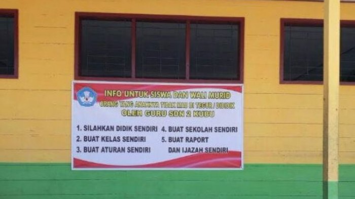 Foto spanduk itu segera menjadi percakapan hangat di grup WhatsApp. Kepala SDN 2 Kubu, Ahmad Isnaini, mengatakan, pemasangan itu sudah berlangsung sekitar satu bulan lalu.