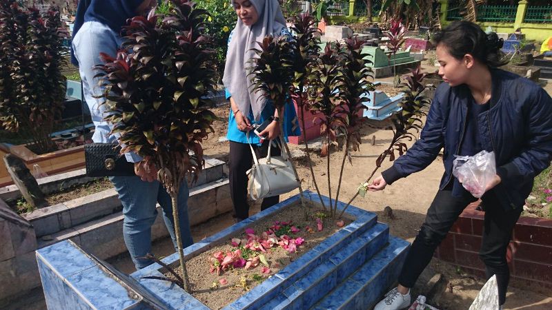 Mereka menaburkan bunga di atas makam. Ada pula yang menyirami air, mencabut rumput-rumput liar yang tumbuh.