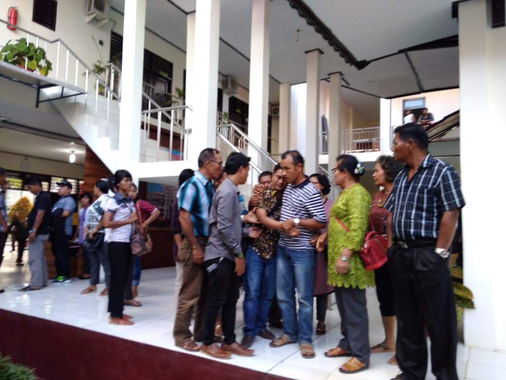 TRIBUNJANBI.COM, TEBO - Keluarga korban pembunuhan Dona Sitorus, Niconius dan Ita Susanti memenuhi ruang sidang pembacaan vonis Wirani Cs di Pengadilan Negeri Tebo, Selasa (26/6).