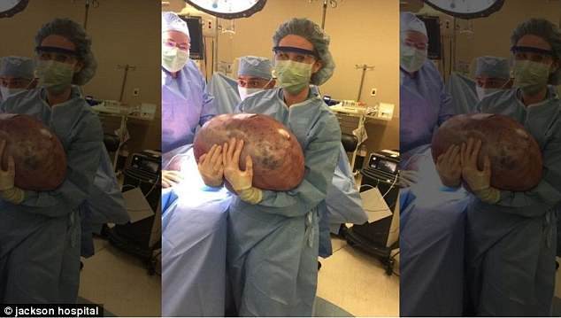 Hampir 23 kilogram kista telah dikeluarkan dari indung telur wanita di Amerika Serikat yang menyebabkannya terlihat
