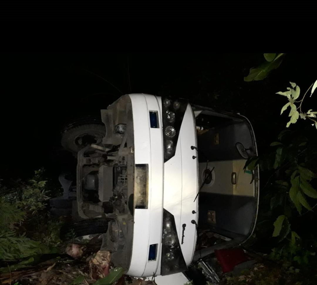 Hal itu membuat mobil bus melaju mundur dan tak terkendali. Bus pun terjatuh ke dalam jurang sedalam dua meter.