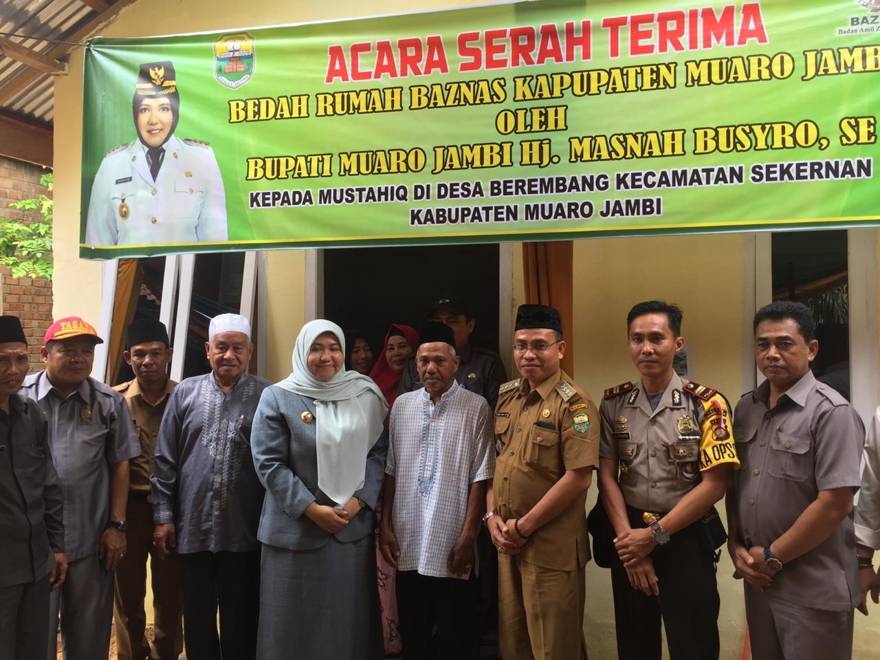 TRIBUNJAMBI.COM, SENGETI - Bupati Muarojambi, Masnah Busro meresmikan Bedah Rumah Baznas Kabupaten Muarojambi kepada Mustahiq Desa Berembang, Kecamatan Sekernan, Kabupaten Muarojambi, Selasa (15/1/2019).