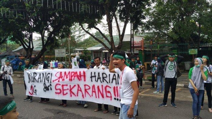 Bayu berorasi di depan spanduk yang bertuliskan "Kurangi Sampah Harian dari Sekarang!".