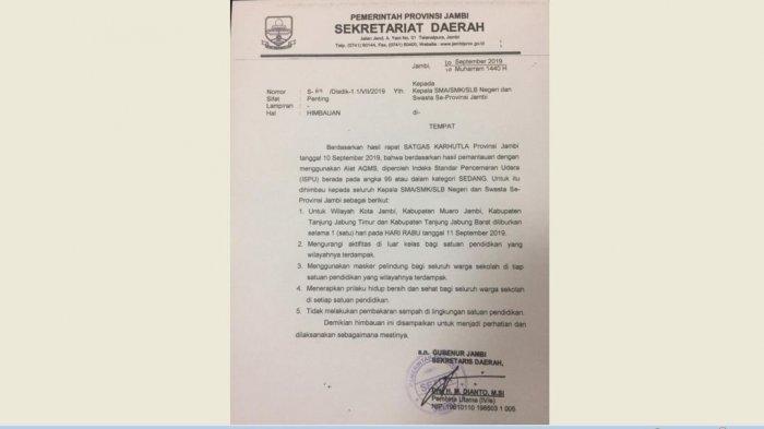 Kepala Biro Humas Protokol Provinsi Jambi Johansyah mengatakan, surat imbauan sudah ditandatangani Sekda Provinsi Jambi M Dianto, dan beritahukan kepada pihak sekolah, Selasa (10/9/2019).