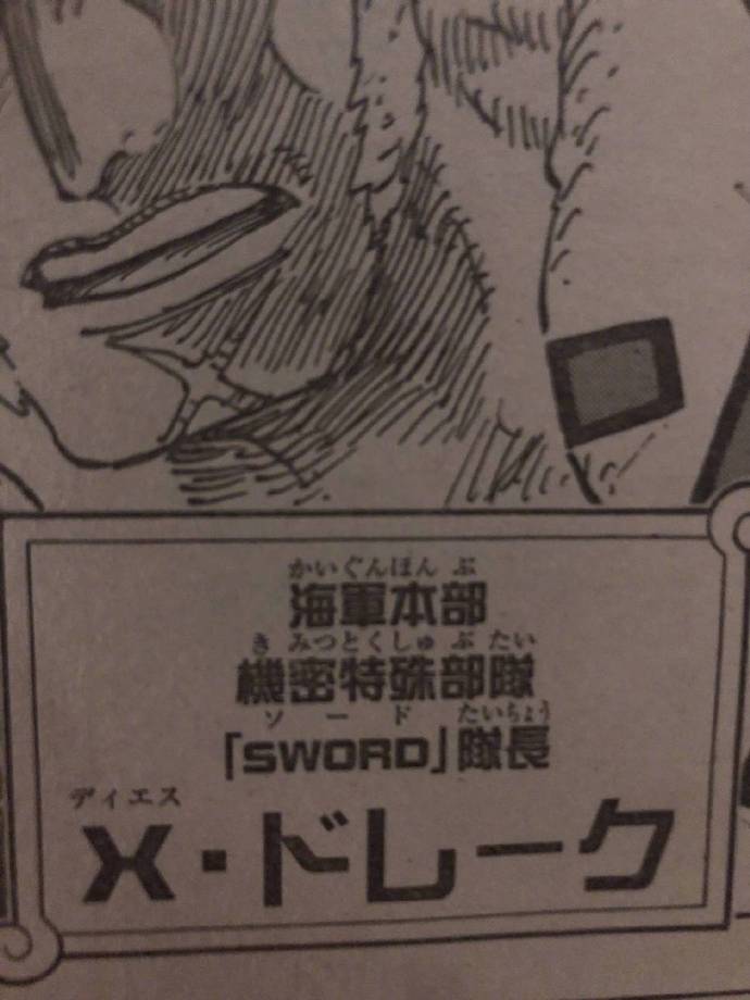 -Drake melaporkan kepada Coby tentang aliansi antara Kaido dan Big Mom. ia juga menyaksikan CP0 di Wano dan juga bilang bahwa Luffy belum berhasil kabur dari penjara.