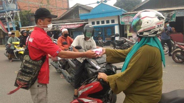 TRIBUNJAMBI.COM, KUALA TUNGKAL - Di tengah kepungan kabut asap yang masih melanda Kabupaten Tanjung Jabung Barat, wartawan di Tanjab Barat membagikan 4.000 lembar masker ke pengguna jalan yang melintas di Simpang Wisno, Jalan Jenderal Sudirman, Jumat (20/9/2019).
