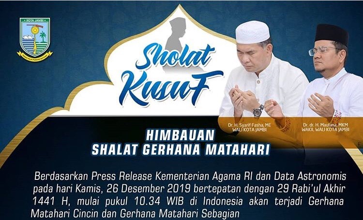 Mengingat akan terjadinya gerhana matahari, Wali Kota Jambi Syarif Fasha mengimbau kepada seluruh masyarakat muslim di Jambi untuk melakukan salat gerhana matahari pada Kamis (26/12) pukul 10.34 WIB.