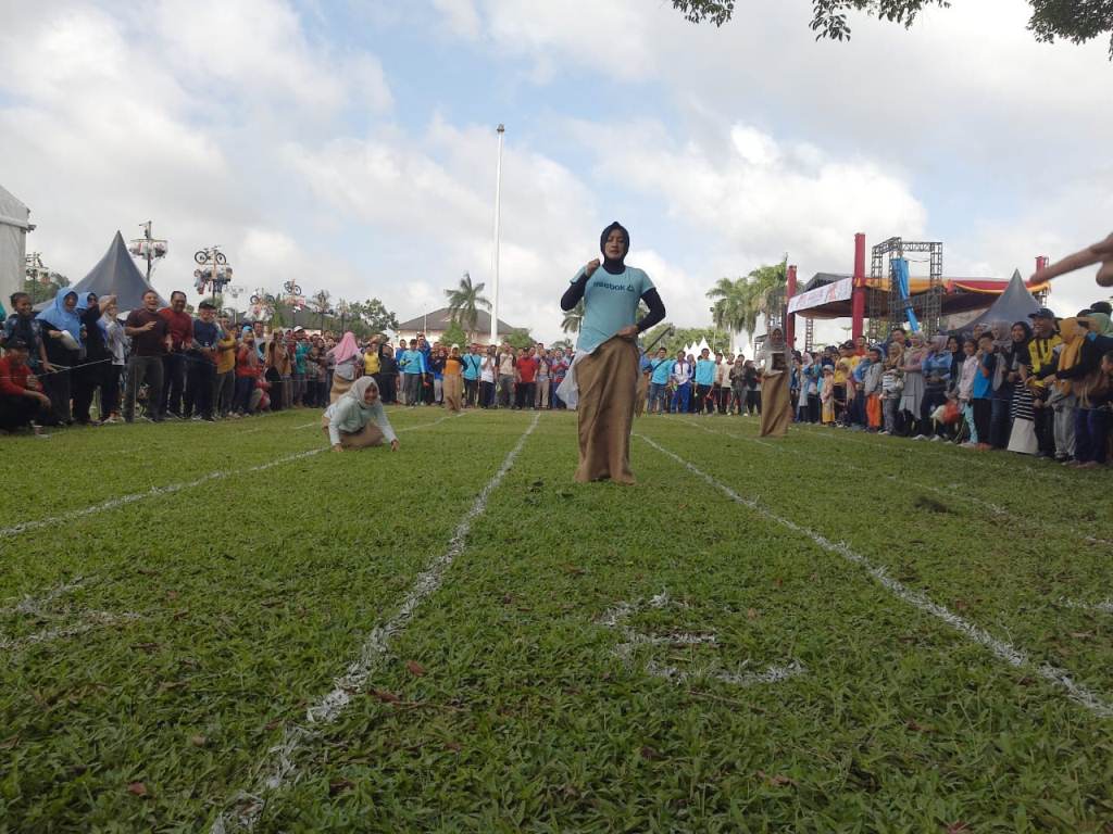 Balap karung di lapanan Kantor Gubernur Jambi menjadi pusat perhatian dan tontonan menarik dalam petingatan HUT Provinsi Jambi ke-63.