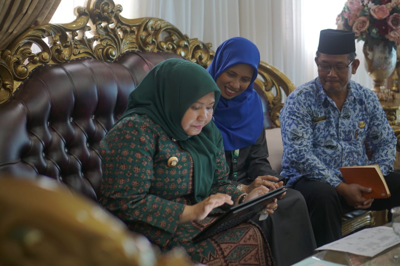 TRIBUNJAMBI.COM, SENGETI-Badan Pusat Statistik (BPS) Kabupaten Muarojambi mengawali sensus penduduk dengan mendata anggota keluarga Bupati dan Wakil Bupati Muarojambi, Senin (17/2). Pendataan anggota keluarga Bupati Muarojambi, Masnah Busro dilakukan di Rumah Dinas Bupati Muarojambi, Bukit Cinto Kenang.