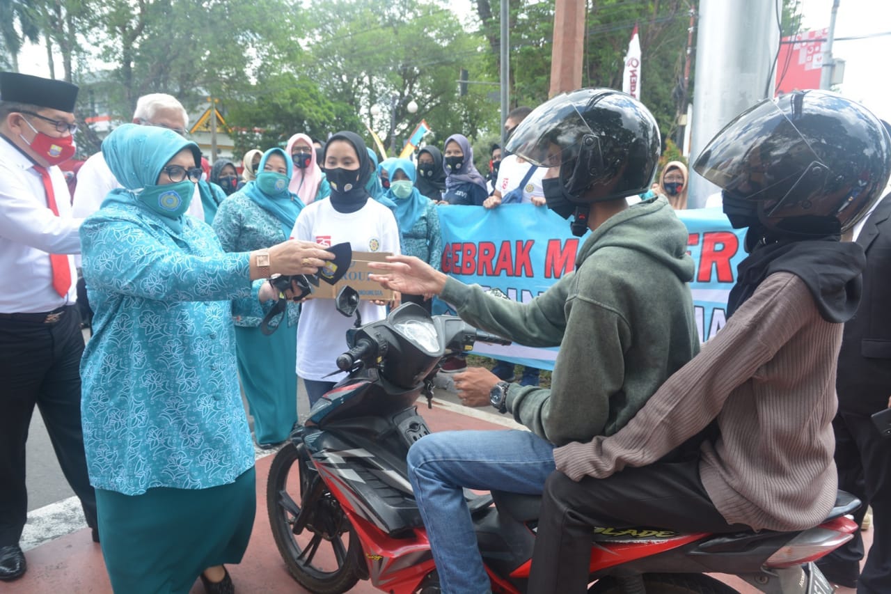 TRIBUNJAMBI.COM - Usai mengikuti Teleconference Pelepasan Gerakan Nasional yang bertajuk Gerakan Bersama Memakai Masker yang disebut “Gebrak Masker” bersama Tim Penggerak PKK dan Ikatan Keluarga Alumni Pendidikan Tinggi Kepamongprajaan (IKAPTK) yang dilepas oleh Ketua Umum Tim Penggerak Pemberdayaan Kesejahteraan Keluarga (TP PKK) Tri Tito Karnavian, Ketua TP PKK Provinsi Jambi Hj.Rahima Fachrori turun langsung ke lapangan untuk membagikan masker kepada masyarakat di persimpangan Bank Indonesia, Senin (17/8) siang.