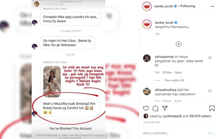 "Maaf ya mba, Mba kayak bintang-bintang film bokep Korea yang cantik-cantik tuh," tulis sang netizen yang mengomentari unggahan Instastory Bunga.
