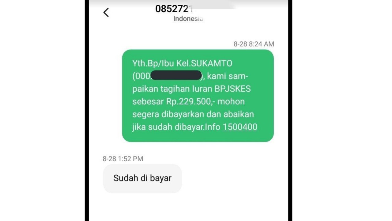 TRIBUNJAMBI.COM, JAMBI - Jika ponsel pintar anda mendapat pesan singkat yang berisikan " Yth.Bp/Ibu Kel. AngxxxxxxA (000xxxxxx), kami sampaikan tagihan Iuran BPJSKES sebesar Rp.42x.xxx,- mohon segera dibayarkan dan abaikan jika sudah dibayar. Apabila membutuhkan informasi dapat menghubungi 1500400", mohon jangan diabaikan, karena BPJS Kesehatan sedang mengingatkan tentang kewajiban yang harus peserta lakukan.