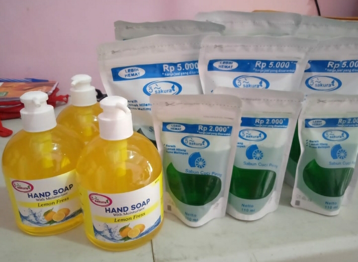 Satu di antaranya sabun cuci piring yang di produksi oleh Ary Darma Harahap dengan merek sabun cuci piring dan cuci tangan Sakura.