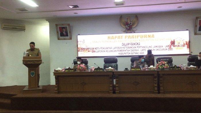 TRIBUNJAMBI.COM, MUARABULIAN - Bupati Batanghari menyampaikan Laporan Keterangan Pertanggungjawaban Daerah atau LKPD 2020 melalui sidang paripurna DPRD Batanghari, Senin (22/3/2021).