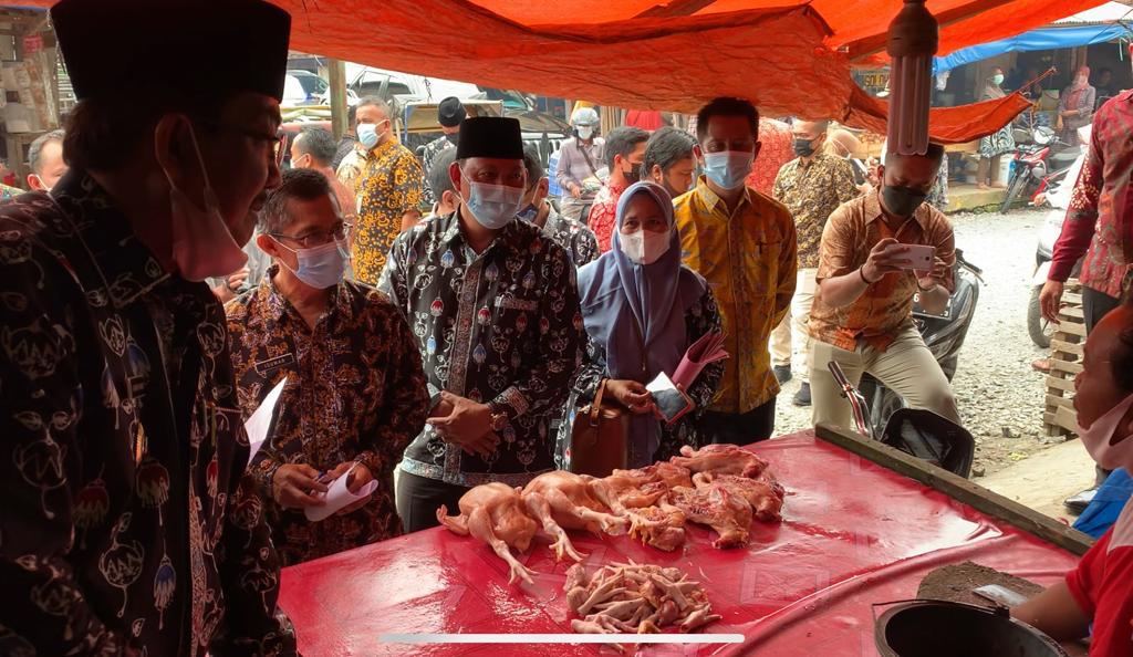 TRIBUNJAMBI.COM, KUALATUNGKAL - Jelang pelaksanaan ibadah puasa, Bupati Kabupaten Tanjabbar, Anwar Sadar bersama Wakil Bupati Tanjabbar, Hairan dan di dampingi oleh Kapolres Tanjabbar, AKBP Guntur Saputro bersama dengan OPD terkait melakukan pengecekan harga ke Pasar Tanggo Rajo, Kuala Tungkal, Kamis (8/4/2021).