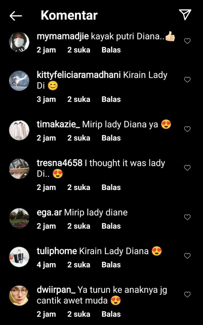 "Mirip lady Diana ya," tutur @timakazie_.