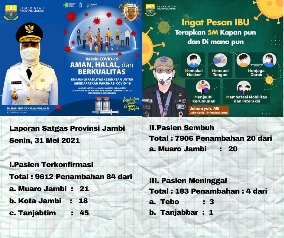 TRIBUNJAMBI.COM, JAMBI - Pasien terkonfirmasi positif covid-19 masih terus bertambah. Senin (31/5/2021) tercatat ada 84 orang pasien baru di Provinsi Jambi.