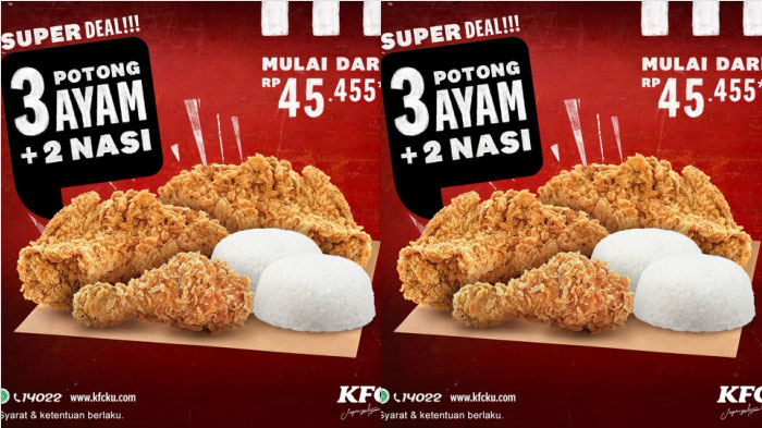 Dengan harga segitu Tribunners bisa nikmatin 3 potong ayam goreng plus 2 nasi di KFC.