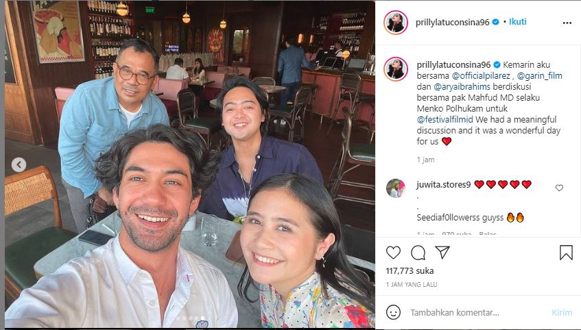 “Kemarin aku bersama @officialpilarez (reza rahardian) @garin film, dan @aryaibrahims berdiskusi bersama bapak Mahfud MD selaku Menko Polhukam untuk @festivalfilmid” tulis Prilly Latuconsina