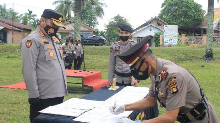TRIBUNJAMBI.COM, MUARABULIAN- Kapolres Batanghari AKBP Heru Ekwanto pimpin upacara serah terima jabatan (Sertijab) di Mako Polres Batanghari, Senin (25/10/2021).