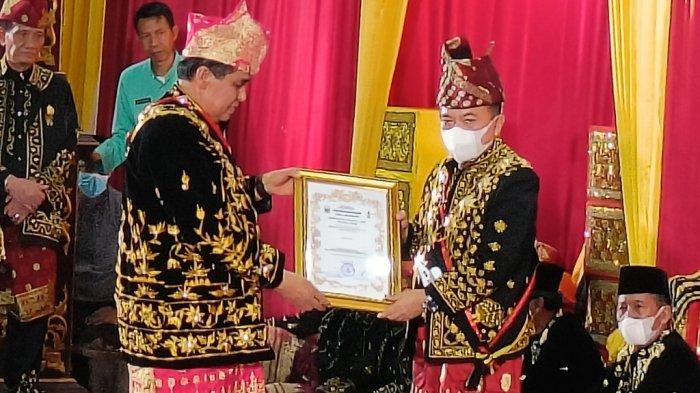 Gubernur Jambi Al Haris yang juga selaku Pembina Adat Melayu Jambi menerima penghargaan langsung dari Ketua Umum Lembaga Adat Provinsi Jambi Hasan Basri Agus (HBA).
