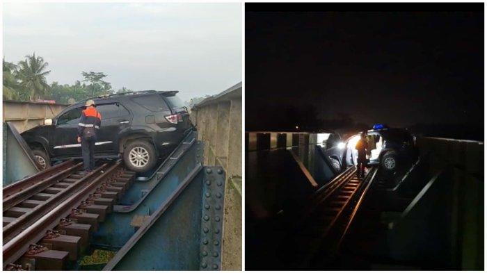 Mobil Fortuner bernopol B-15559-NCQ asal Jambi yang akan mudik ke Jawa Tengah tiba-tiba melaju di perlintasan kereta api dan tersangkut di jembatan