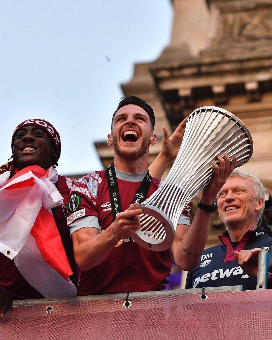 Tindakan terakhir Rice sebagai pemain West Ham adalah menjadi kapten ketiga dalam sejarah mereka, di belakang Bobby Moore dan Billy Bonds, yang mengangkat trofi besar setelah kemenangan Liga Konferensi Eropa bulan lalu atas Fiorentina.