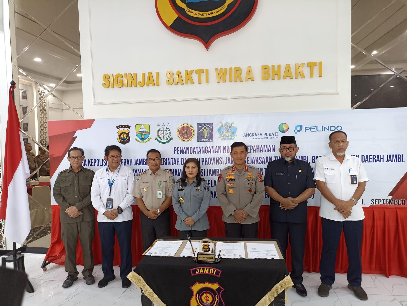 Penandatanganan nota kesepahaman digelar di lobby gedung utama Polda Jambi tersebut, dilakukan bersama Pemprov Jambi, Kejaksaan Tinggi Jambi, Badan Intelijen Daerah Jambi, Kanwil Kemenkumham Provinsi Jambi, Balai Karantina Kesehatan Jambi, PT Pelindo Regional 2 Jambi dan PT Angkasa Pura Jambi.