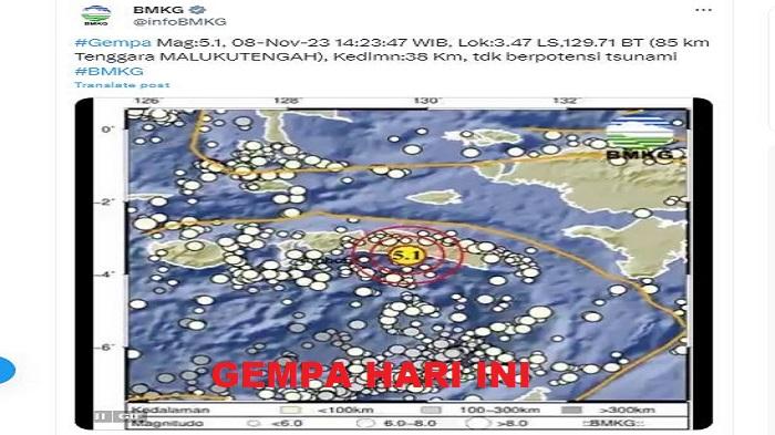 "#Gempa Mag:5.1, 08-Nov-23 14:23:47 WIB, Lok:3.47 LS,129.71 BT (85 km Tenggara MALUKUTENGAH), Kedlmn:38 Km, tdk berpotensi tsunami #BMKG," dilansir dari X @infoBMKG.