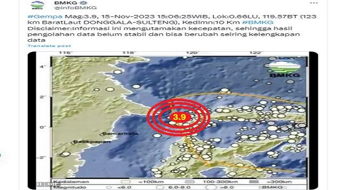 "#Gempa Mag:3.9, 15-Nov-2023 15:06:25WIB, Lok:0.66LU, 119.57BT (123 km BaratLaut DONGGALA-SULTENG), Kedlmn:10 Km #BMKG," dilansir dari X @infoBMKG.