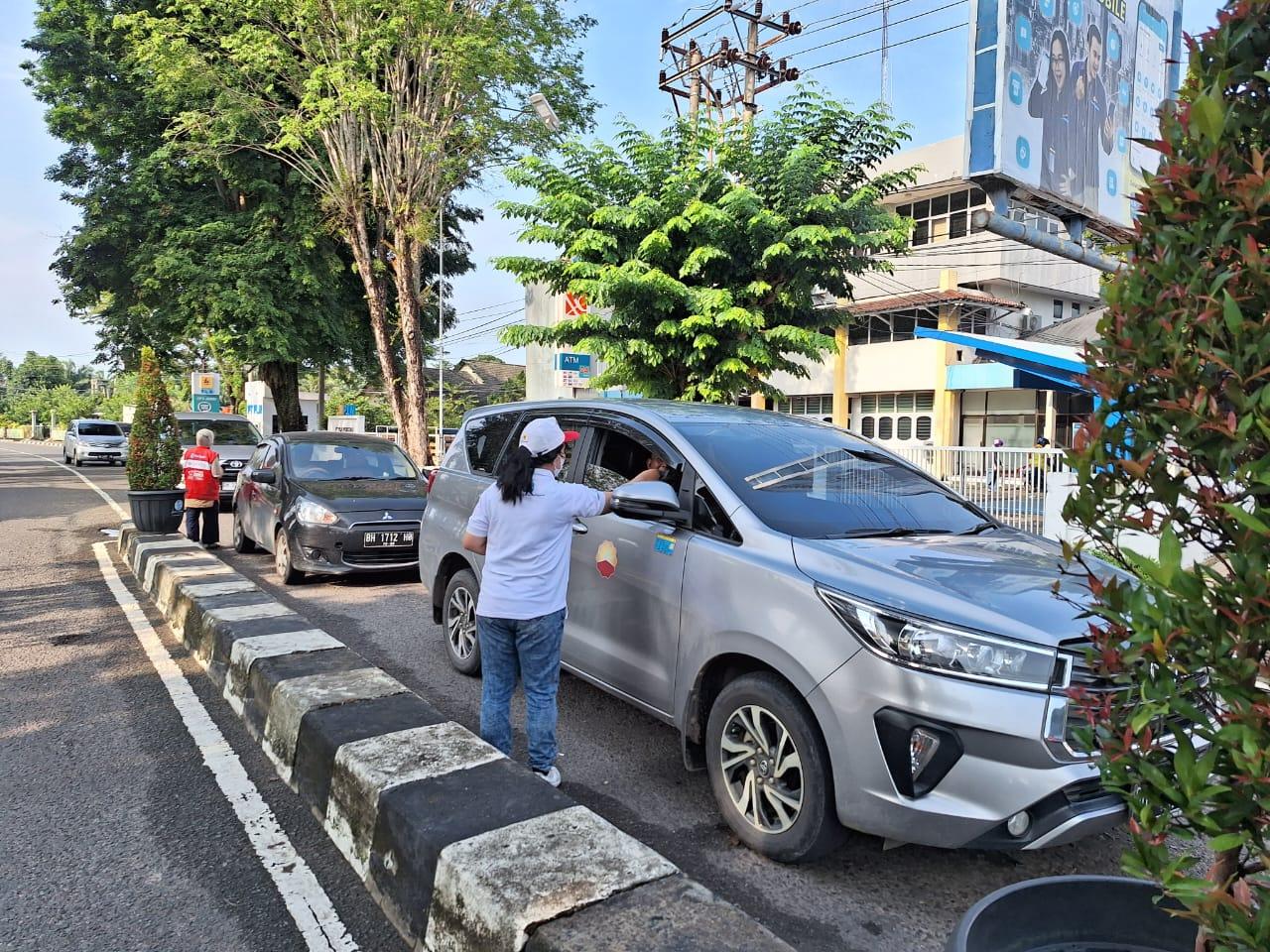 Sosialisai dengan membagikan brosur kepada pengguna kendaraan roda dua dan kedaraaan roda empat.
