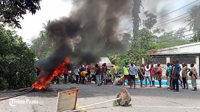 TRIBUNJAMBI.COM - Warga Jalan Poros Mapurujaya Timika memblokade akses lalu lintas di pertigaan Kantor Polsek Mimika Timur dan Kantor Distrik, Mimika, Papua Tengah, Sabtu (2/12/2023).