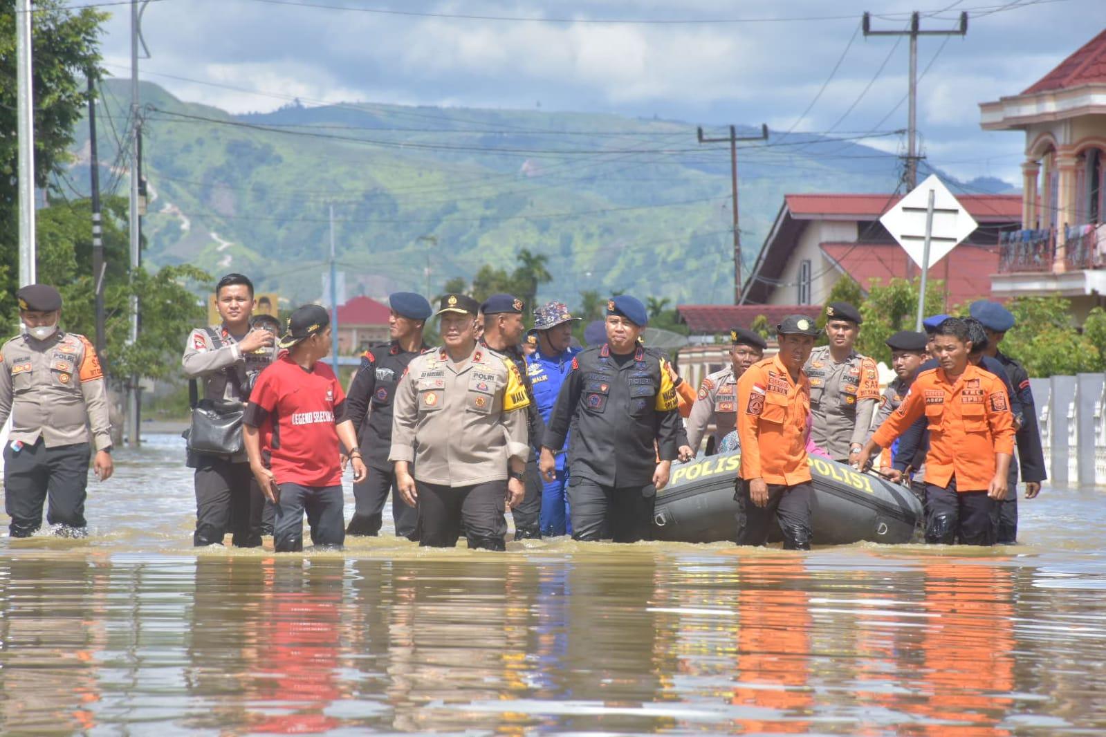 Selanjutnya Wakapolda beserta rombongan memberikan langsung dengan turun ke lokasi banjir kepada warga yang masih terdampak banjir dengan menggunakan 2 unit perahu karet dan berjalan kaki menuju rumah warga.