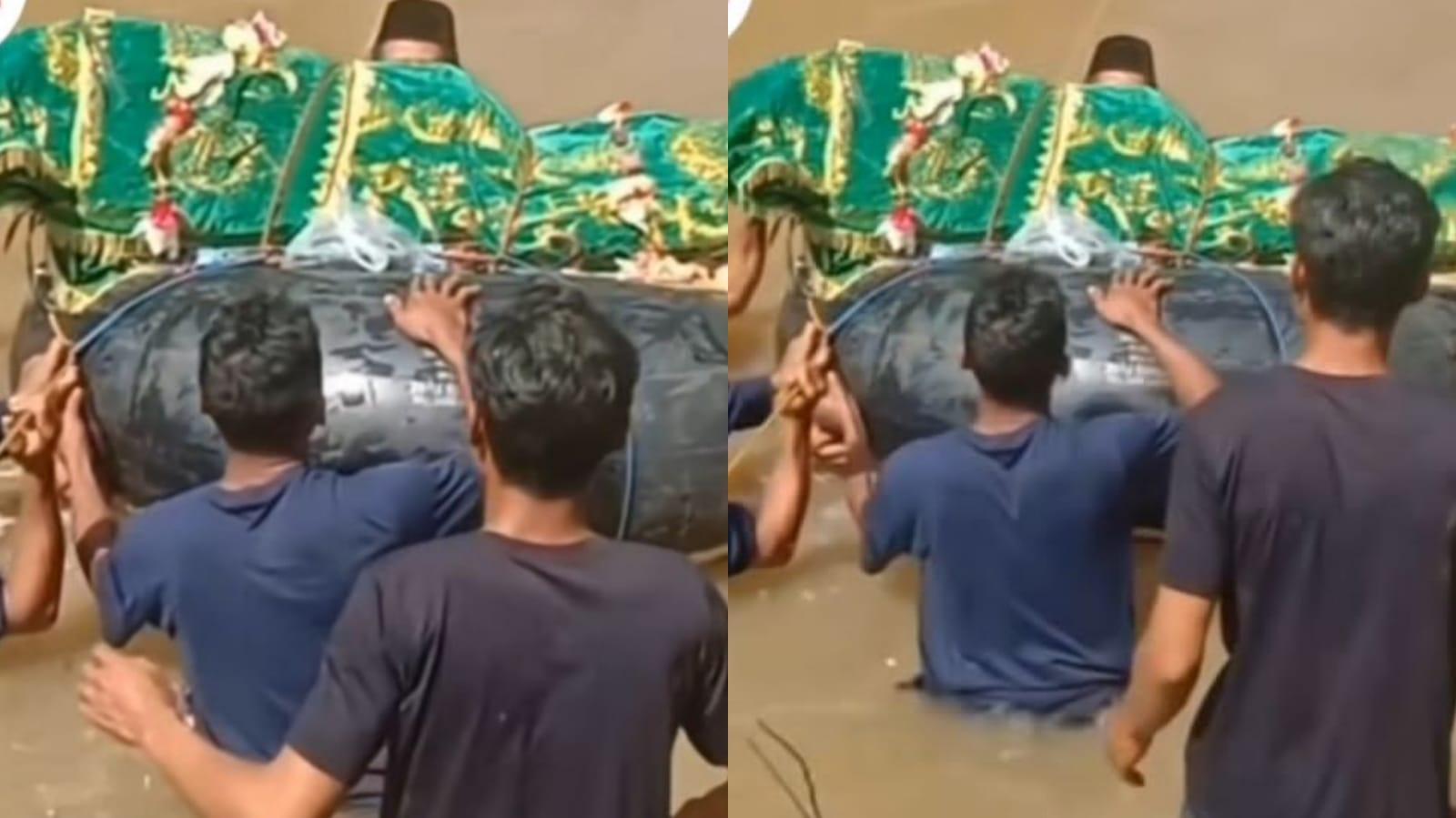 Dari video yang beredar tampak sejumlah warga mengiringi jenazah sambil berenang sambil berenang.