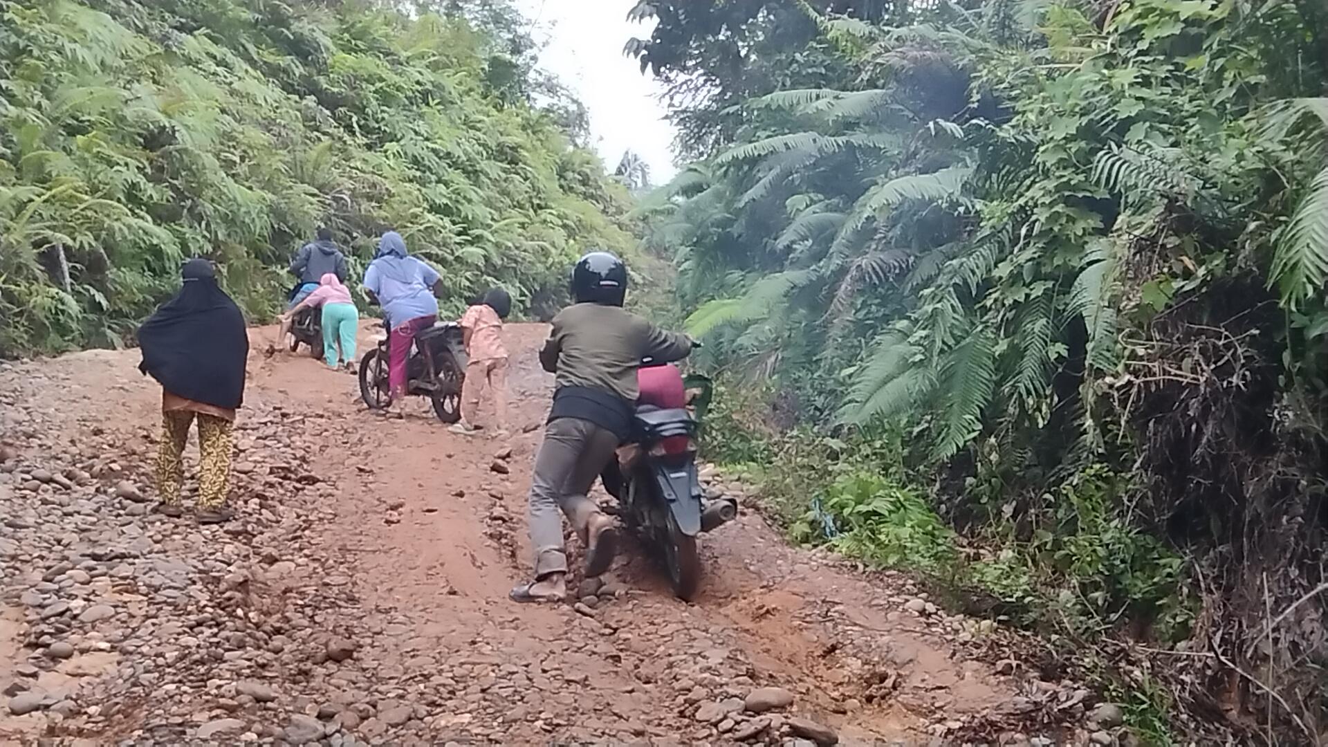 "Jalan ini satu-satunya akses desa kami mau ke desa tetangga, tidak ada pilihan kami terpaksa melewati jalan ini, meskipun sangat licin. Kadang- kadang berdorong supaya bisa melewati jalan ini," tutupnya.