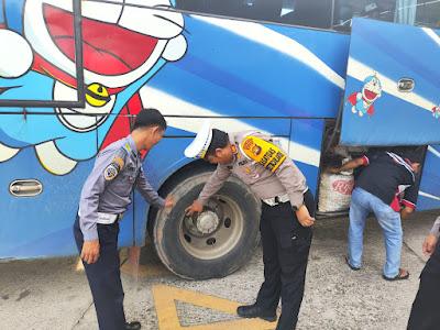 TRIBUNJAMBI.COM,SAROLANGUN-Menjelang mudik lebaran Idul Fitri 1445 hirjiah tahun 2024, Satuan Lalulintas Polres Sarolangun melakukan ram check atau inspeksi keselamatan terhadap kendaraan umum, di Terminal bus Sribulan Sarolangun, Sabtu (6/4/24).