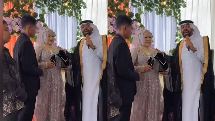 Tampak pria itu membawa kalung emas hadiahnya itu hingga ke atas pelaminan.