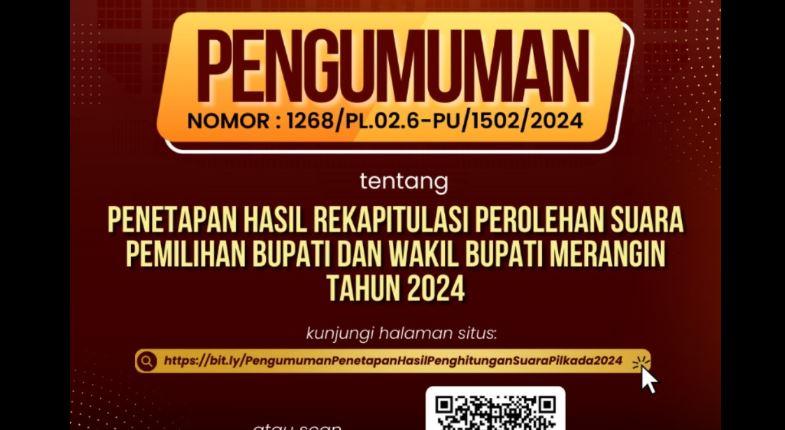 Berdasarkan Pengumuman Nomor : 1268/PL.02.6-Pu/1502/2024 Tentang Penetapan Hasil Penghitungan Perolehan Suara Tingkat Kabupaten Merangin Pada Pemilihan Serentak Tahun 2024, serta Keputusan KPU Kabupaten Merangin Nomor : 1749 Tahun 2024 Tentang Penetapan Hasil Pemilihan Bupati dan Wakil Bupati Merangin Tahun 2024.